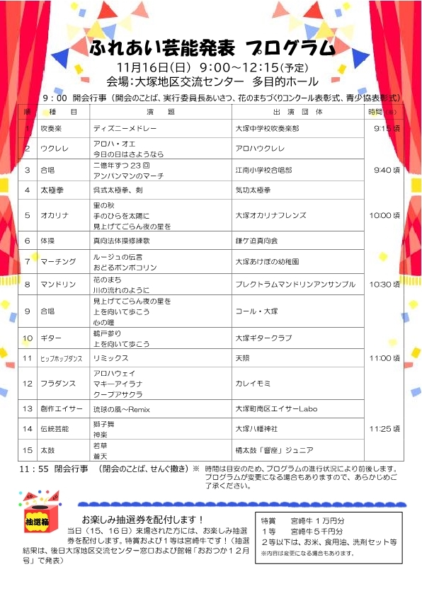 ふれあい芸能発表・・・・・大塚地区交流センター講座グループ・自主グループ、地区内の園児・児童・生徒、地区内団体による芸能発表